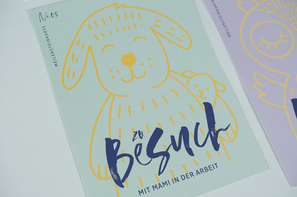 Vier Stück Meilensteinkarten sorgen dafür, dass Mitarbeiter während der Babypause hilfreiche Tipps zu wichtigen Themen rund um den Wiedereinstieg erhalten – die süßen Tierillustrationen unterstreichen je nach Abschnitt diese besondere Zeit – und begleiten so vom Beginn der Schwangerschaft bis zum Wiedereinstieg.